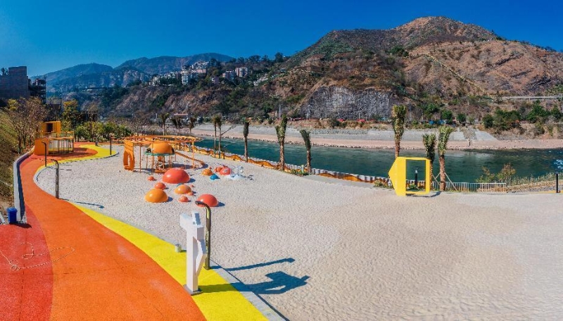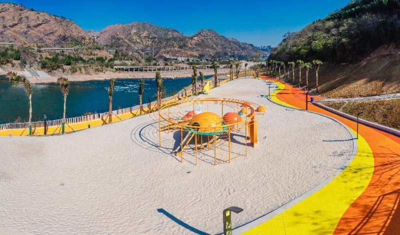 銀江湖公園項(xiàng)目首開區(qū)設(shè)計策略為串聯(lián)城與江,通過轉(zhuǎn)化生態(tài)價值、激活濱江空間,從而打造一個真正可以親水的濱江公園。首開區(qū)已完成342米濱江棧道和2200平方米的銀江沙灘以及兒童游樂區(qū)打造,集裝箱售賣亭、裝配式公廁、休閑座椅等配套設(shè)施均已安裝完畢。