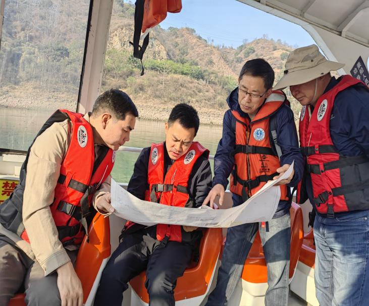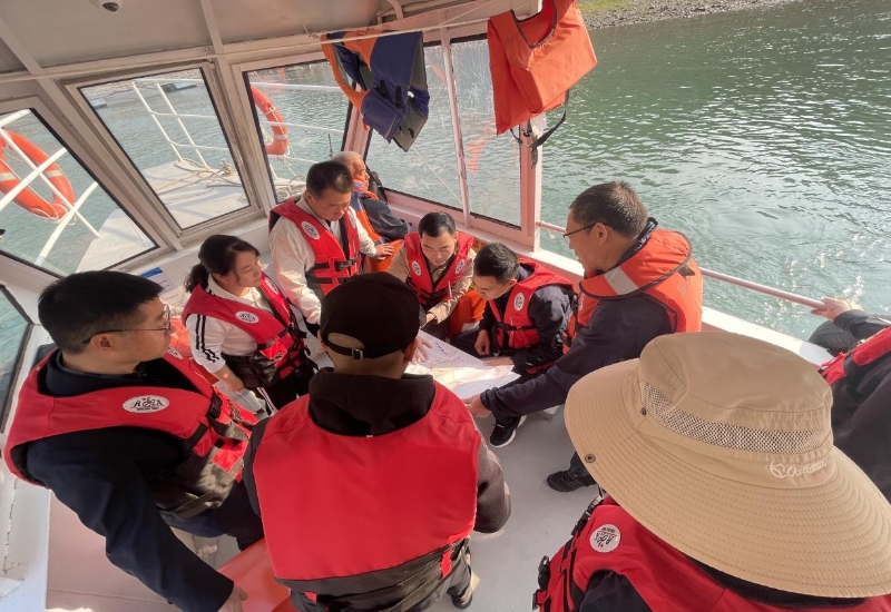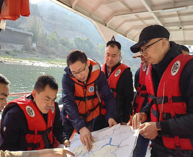 唐忠柱一行乘船從項目起點兩江口(雅礱江與金沙江交匯處)至項目終點平地師莊(四川省與云南省交匯處),沿江查看了航道整治點位和航道維護工作站情況,聽取了項目推進情況工作匯報,對城建交通集團項目前期工作推進的成果表示肯定。