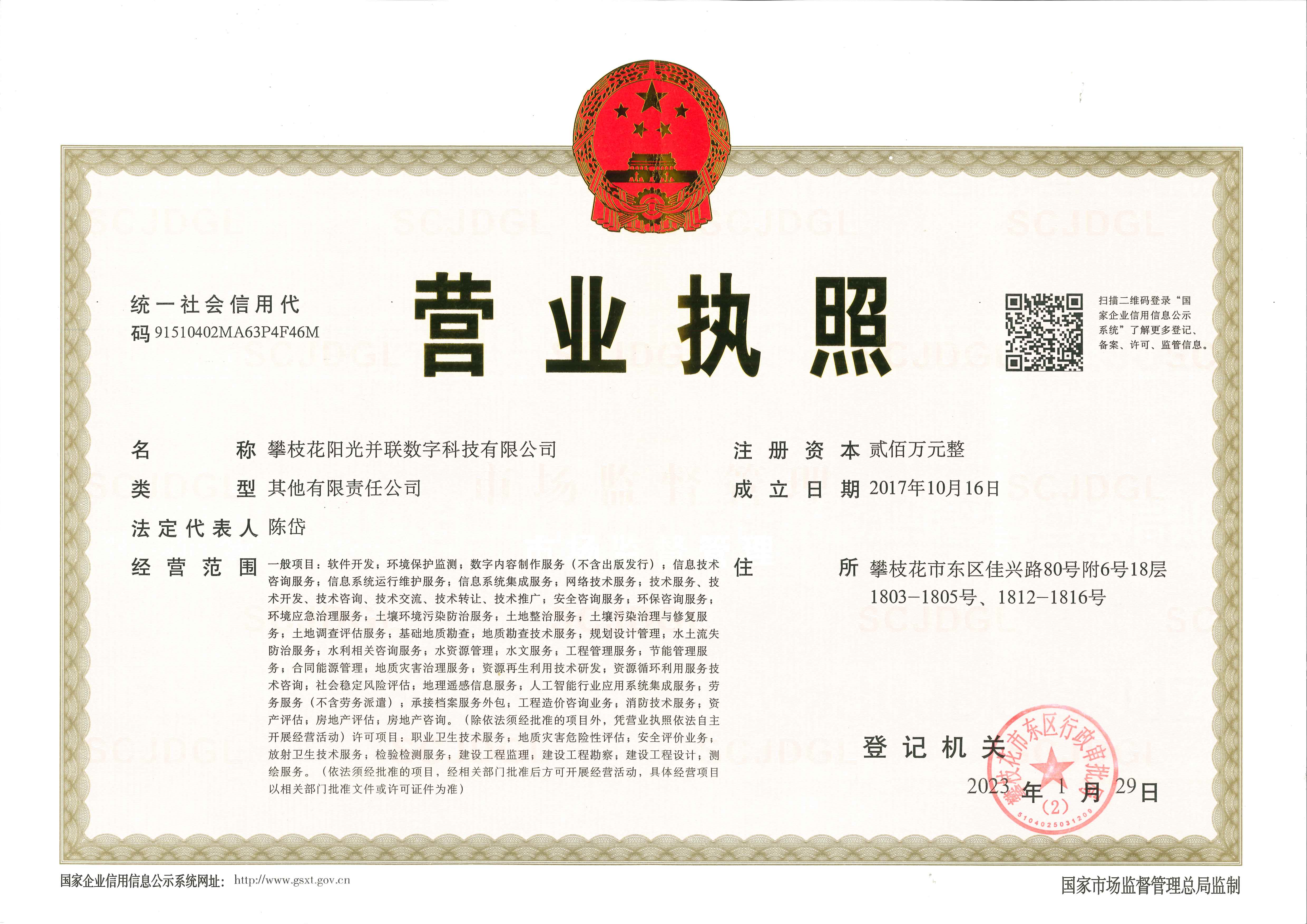 攀枝花陽光并聯(lián)數(shù)字科技有限公司成立于2017年10月,國有控股企業(yè),系攀枝花城建交通(集團)有限公司與四川眾望安全環(huán)保技術咨詢有限公司共同組建。