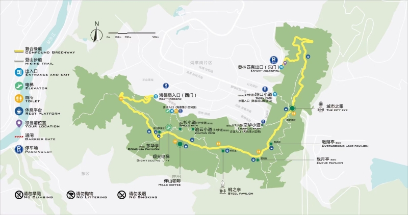 一期主要包括城市之眼、鋼之亭、伴山咖啡、觀光電梯(近期建成投用)、東華亭(暫定名)、瞰湖亭(暫定名)、載月亭(暫定名)等節(jié)點(diǎn)。建有6個(gè)衛(wèi)生間和10個(gè)休憩點(diǎn)位。