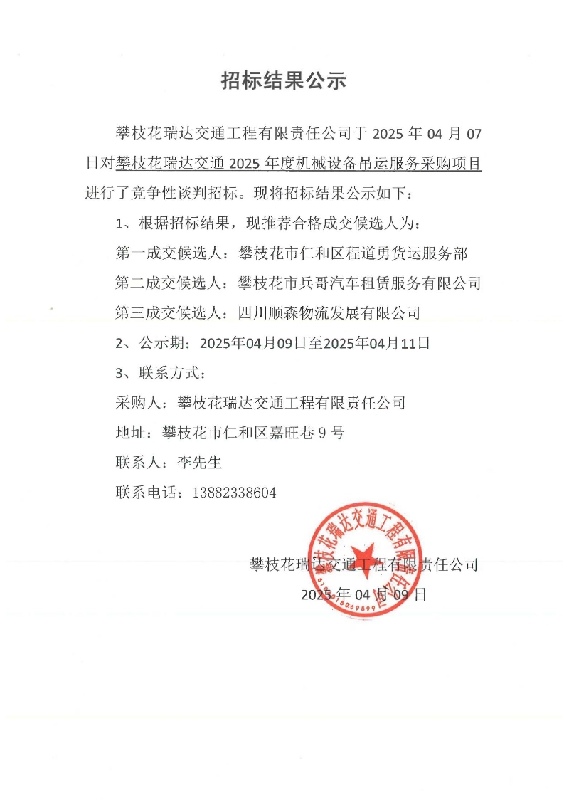攀枝花瑞達(dá)交通2025年度機械設(shè)備吊運服務(wù)采購項目招標(biāo)結(jié)果公示
