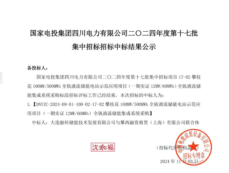 攀枝花城建交通(集團(tuán))有限公司旗下子公司攀西融資租賃(上海)有限公司(簡稱融租公司)與大連融科儲(chǔ)能技術(shù)發(fā)展有限公司作為項(xiàng)目聯(lián)合體,成功中標(biāo)國家電投集團(tuán)四川攀枝花100MW/500MWh全釩液流儲(chǔ)能電站示范應(yīng)用項(xiàng)目(一期實(shí)證12MW/60MWh)全釩液流電池設(shè)備采購,中標(biāo)租賃物價(jià)值3390萬元,期限20年。